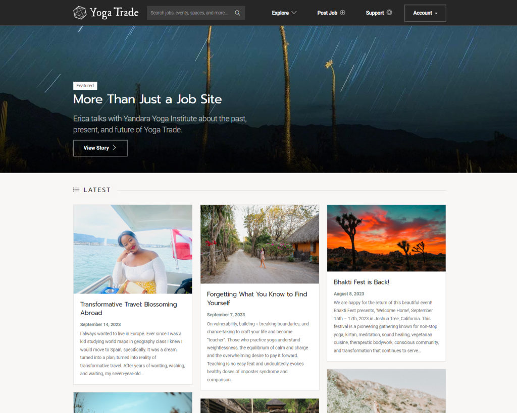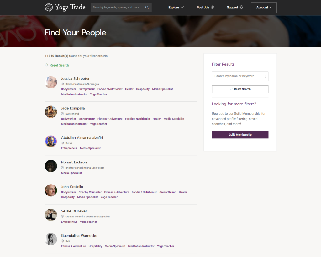 Yoga Trade offers tons of community features. This one specifically highlights actual yoga trade experiences. A free membership let’s users post stories like these. They can interact in the comments, post job listings and opportunities or explore different events, spaces, and destinations.